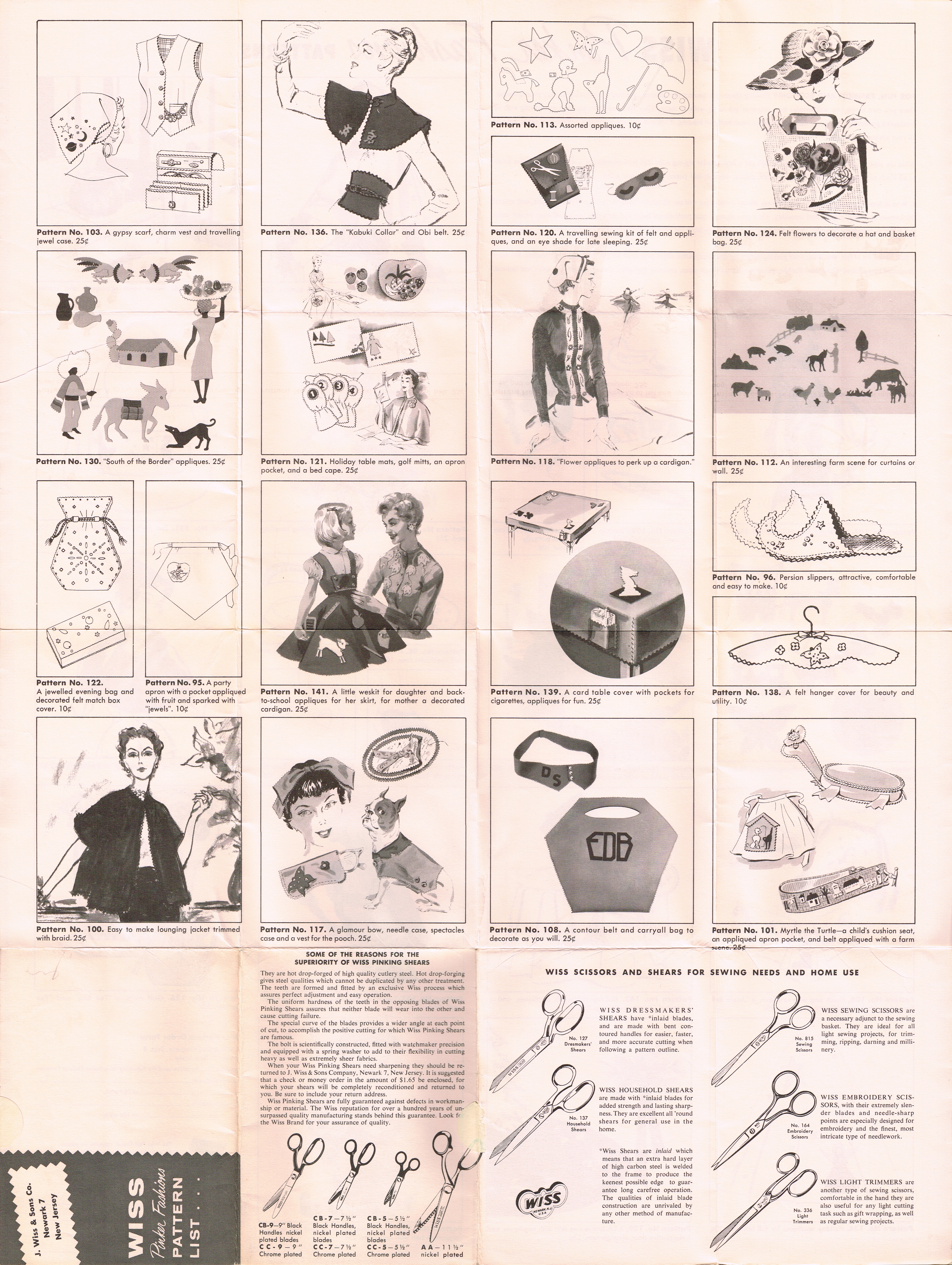 Foldout that showed numerous patterns that were for sale. Folded it is 6-1/4" x 4-3/4" and could be mailed (this one wasn't). Open it is 18-3/4" x 24-3/4". Based on what pinking shears are listed, and resharpening prices, this is circa Late 1950s.