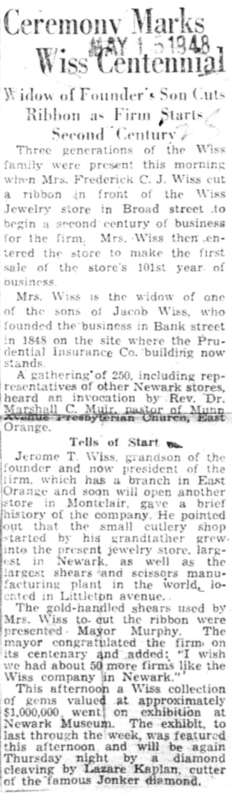 Mrs. Wiss is the widow of one of the sons of Jacob Wiss, who founded the business in Bank street in 1848 on the site where the Prudential Insurance Co. building now stands.
