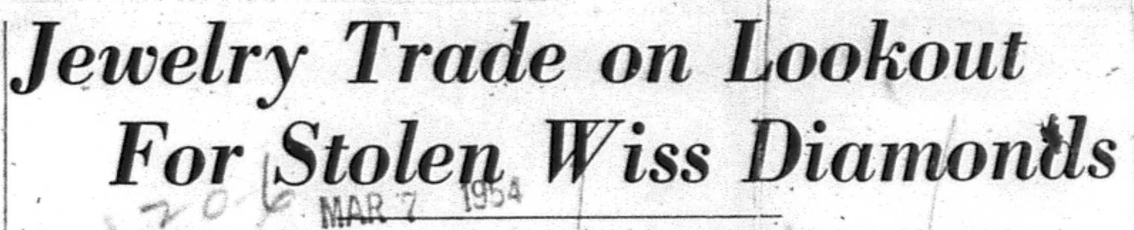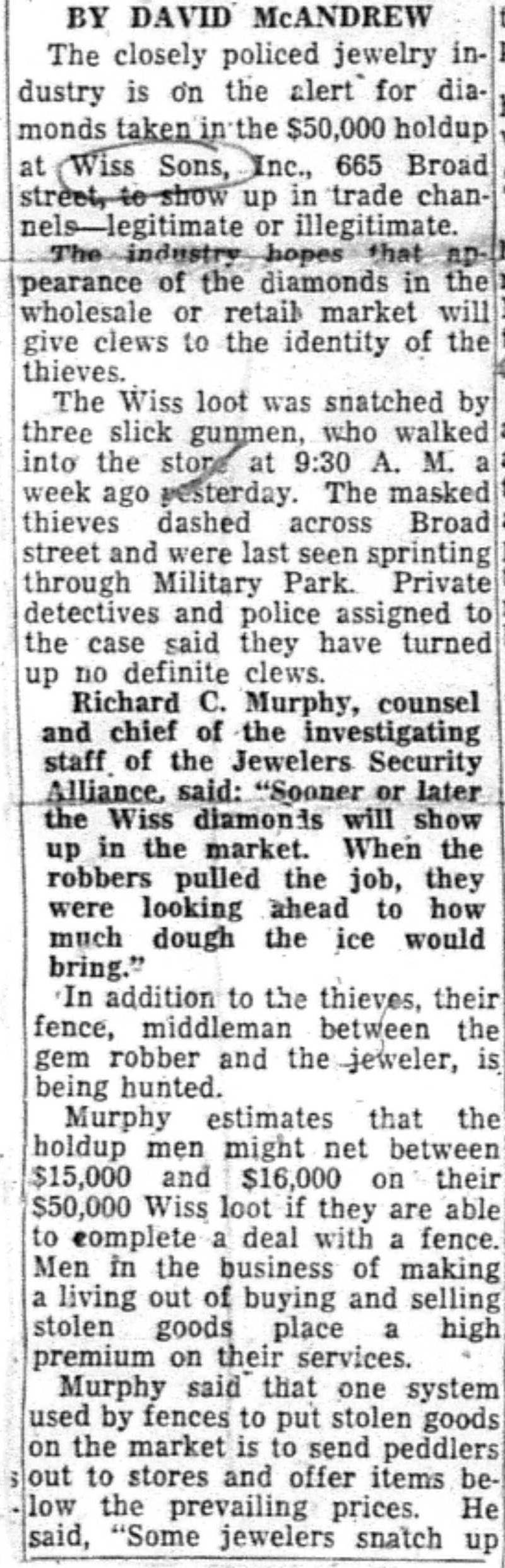 Richard C. Murphy, counsel and chief of the investigating staff of the Jewelers Security Alliance, said: "Sooner or later the Wiss diamonds will show up in the market. When the robbers pulled the job, they were looking ahead to how much dough the ice would bring."