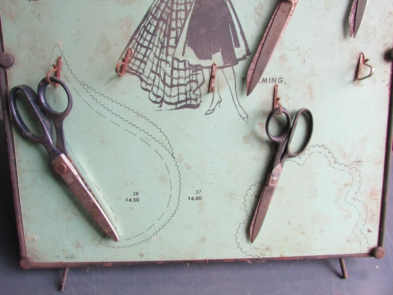 All spaces are for sewing shears and scissors. Painted metal. Passed through eBay September 2017.