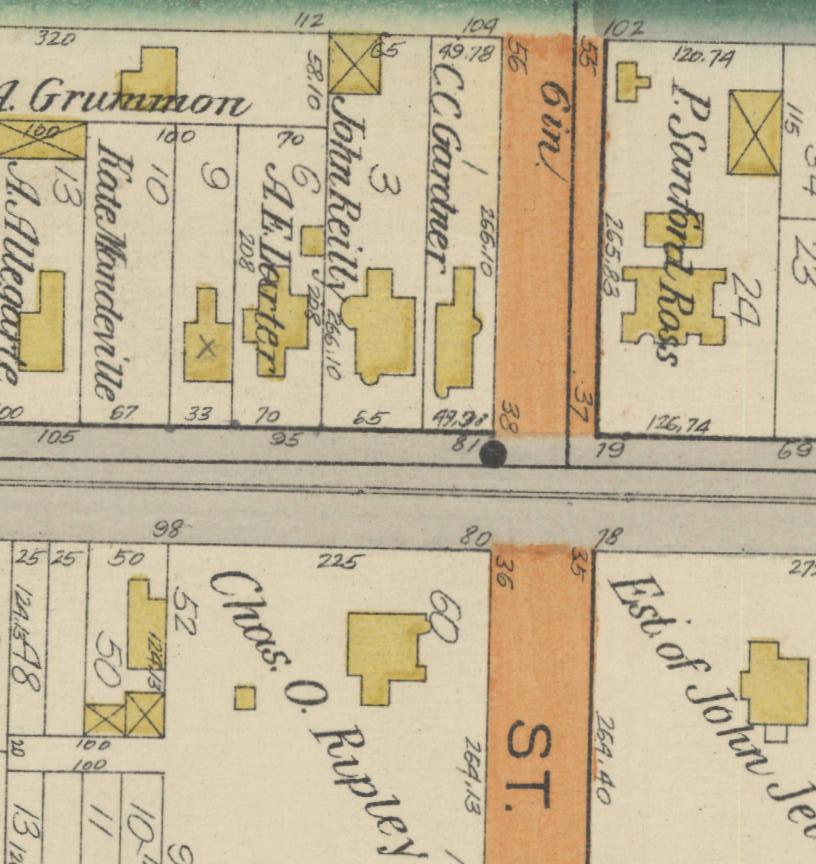 1889. 9 Plum St. Louis lived here for five years (1891-1895). He got married while he was living here. Almost all of the properties on the single block street are owned by the Plum family. Louis would have been renting. You can see the Morris Canal along the left. Source map: Newark Atlas, Plate 3.