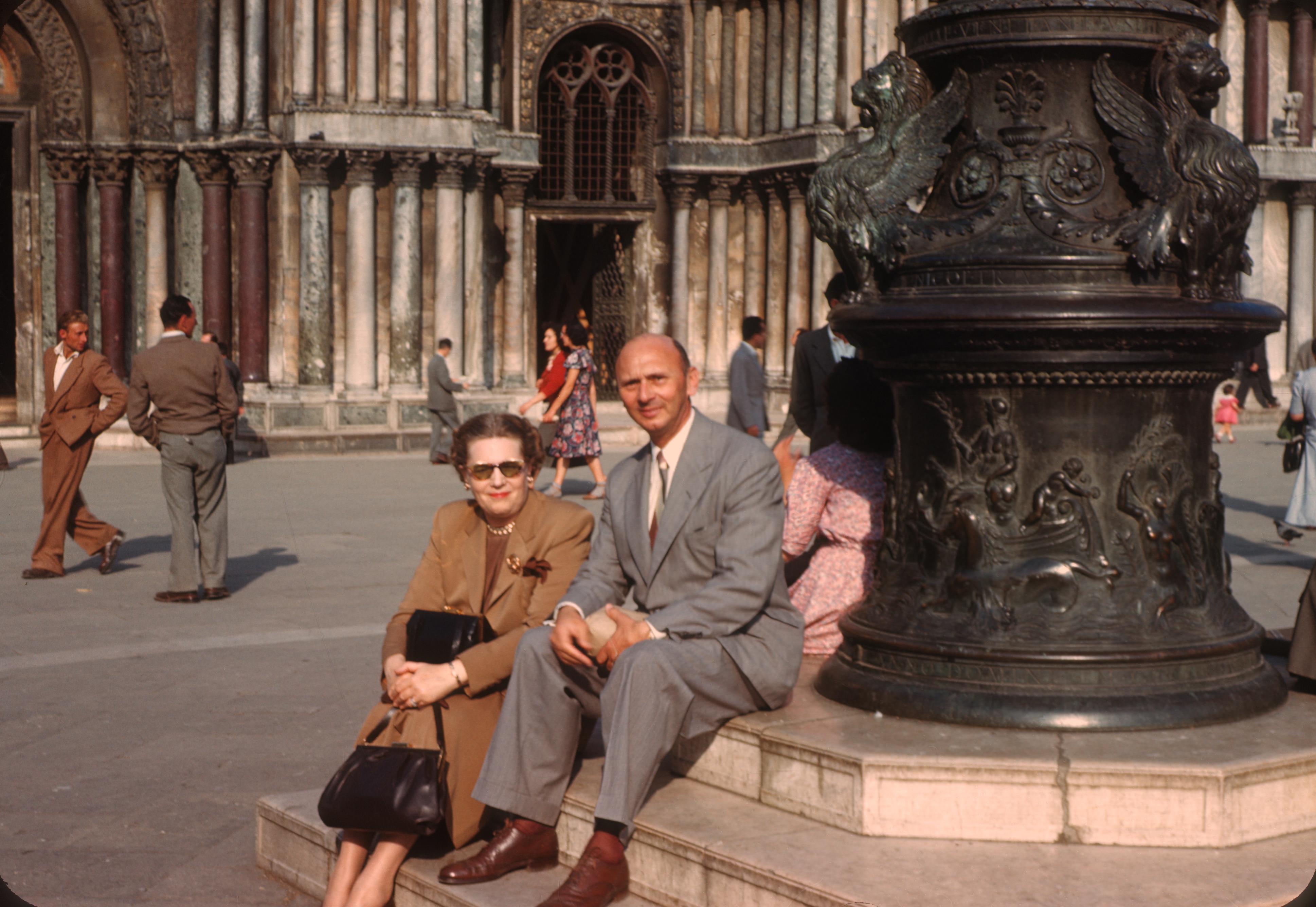 Unknown woman and Norman Wiss. With St. Mark's Basilica behind.
