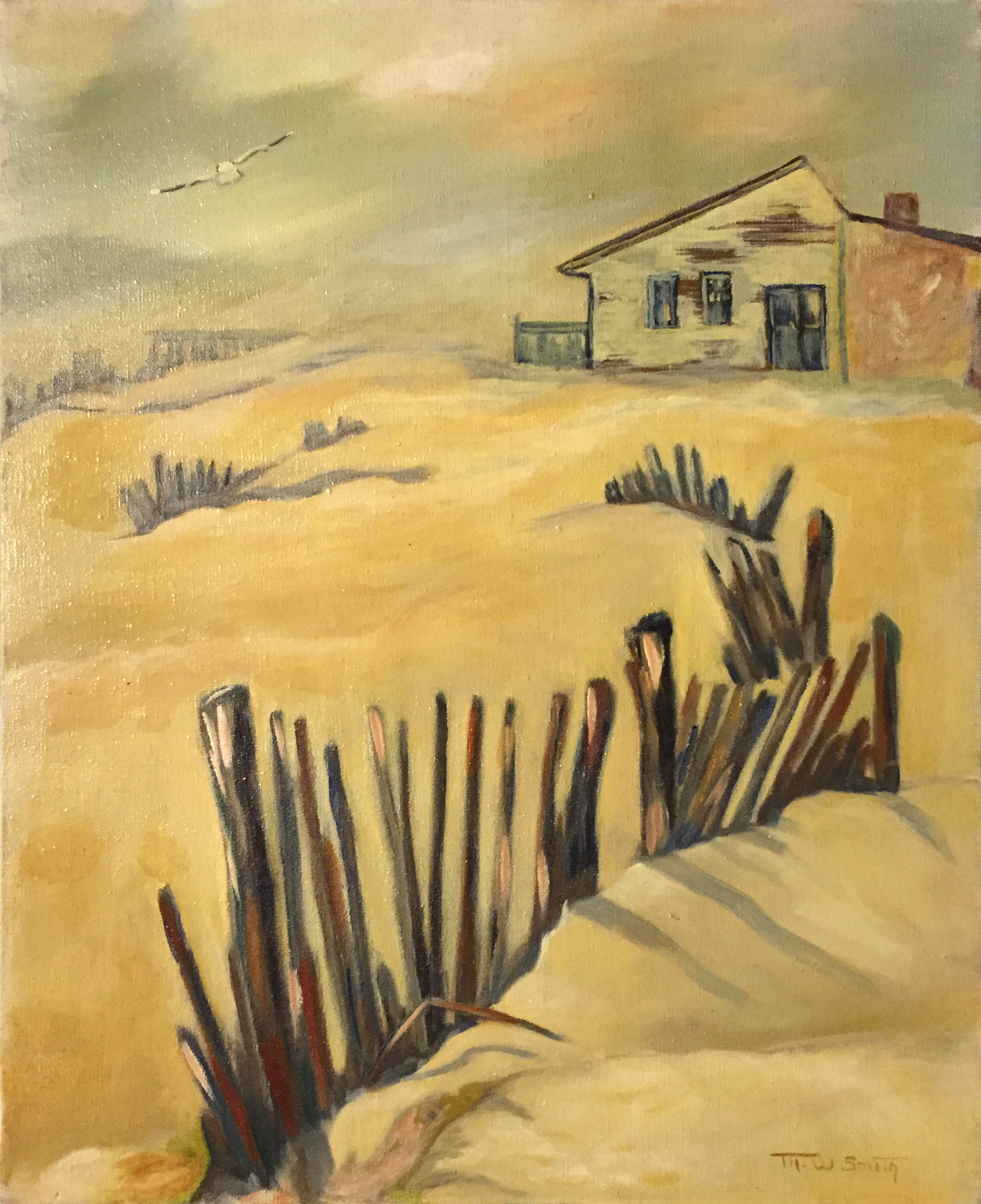 Description by J.K. Flynn: Imagery in this beautiful beach scene depicts a wispy, cloudy sky over small rolling dunes with a meandering wooden fence line making its way to the top of the hill. An asymmetrical beach bungalow sits atop the dunes to the right. The scene overlaps docks and pilings in the background with a lone seagull flying aloft to the left of this composition.