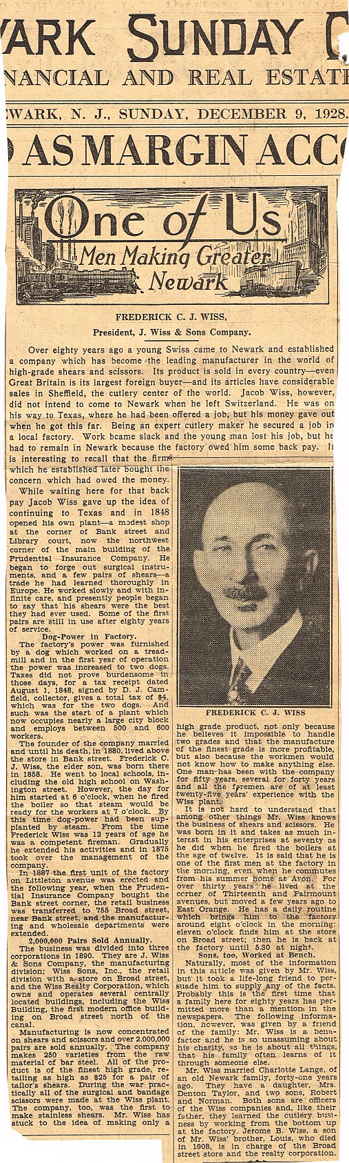 Over eighty years ago a young Swiss came to Newark and established a company which has become the leading manufacturer in the world of high-grade shears and scissors. Its product is sold in every country-even Great Britain is its largest foreign buyer-and its articles have considerable sales in Sheffield, the cutlery center of the world. Jacob Wiss, however, did not intend to come to Newark when he left Switzerland. He was on his way to Texas, where he had been offered a job, but his money gave out when he got this far. Being an expert cutlery maker he secured a job in a local factory. Work became slack and the young man lost his job, but he had to remain in Newark because the factory owed him some back pay. It is interesting to recall that the firm which he established later bought the concern which had owed the money.