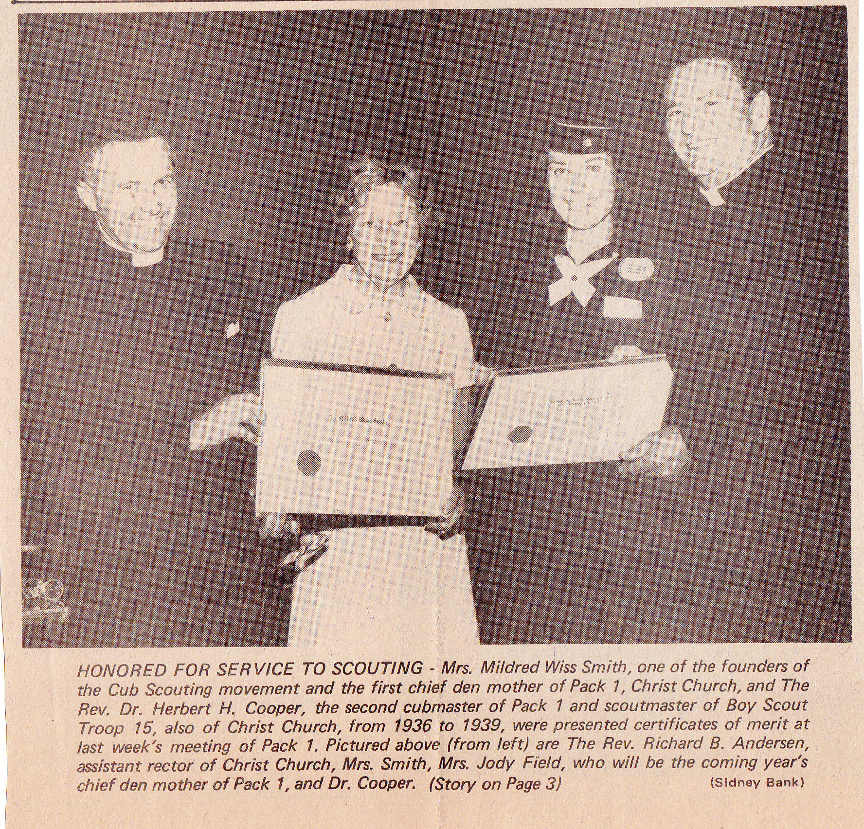 Mrs. Smith was among the founders of the Cub Scout movement in the United States and was the first chief den mother of Pack 1. Dr. Cooper served as Pack 1's second cubmaster and was scoutmaster of Troop 15 from 1936 to 1939. The presentation to Mrs. Smith was made by Dr. Cooper, rector of Christ Church, while his certificate was presented by the Rev. Richard B. Andersen, assistant rector of the church.