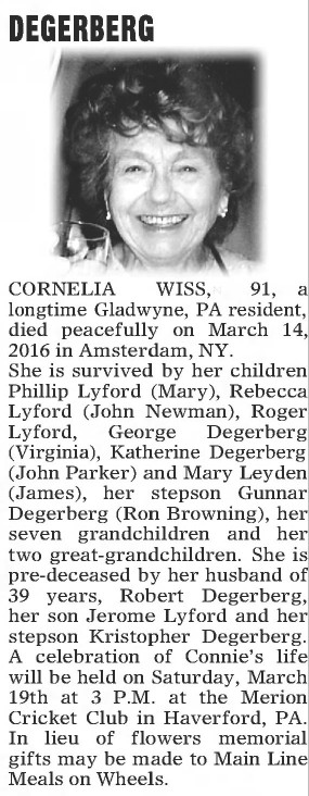 She is survived by her children Phillip Lyford (Mary), Rebecca Lyford (John Newman), Roger Lyford, George Degerberg (Virginia), Katherine Degerberg (John Parker) and Mary Leyden (James), her stepson Gunnar Degerberg (Ron Browning), her seven grandchildren and her two great-grandchildren. She is pre-deceased by her husband of 39 years, Robert Degerberg, her son Jerome Lyford and her stepson Kristopher Degerberg. A celebration of Connie's life will be held on Saturday, March 19th at 3 P.M. at the Merion Cricket Club in Haverford, PA. In lieu of flowers memorial gifts may be made to Main Line Meals on Wheels.