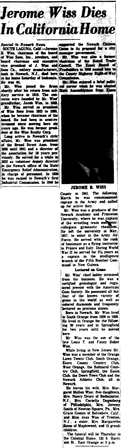 Born in Newark, Mr. Wiss lived in South Orange from 1920 to 1930. He lived in Orange for the following 20 years and in Springfield for two years until he moved here.
